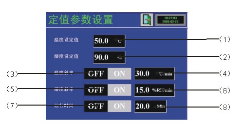 8、定值運行:在運行方式選擇窗口中選擇“定值控制”進入定值控制窗口,在定值控制窗口中按“設置”鍵,進入定值參數(shù)設置窗口,